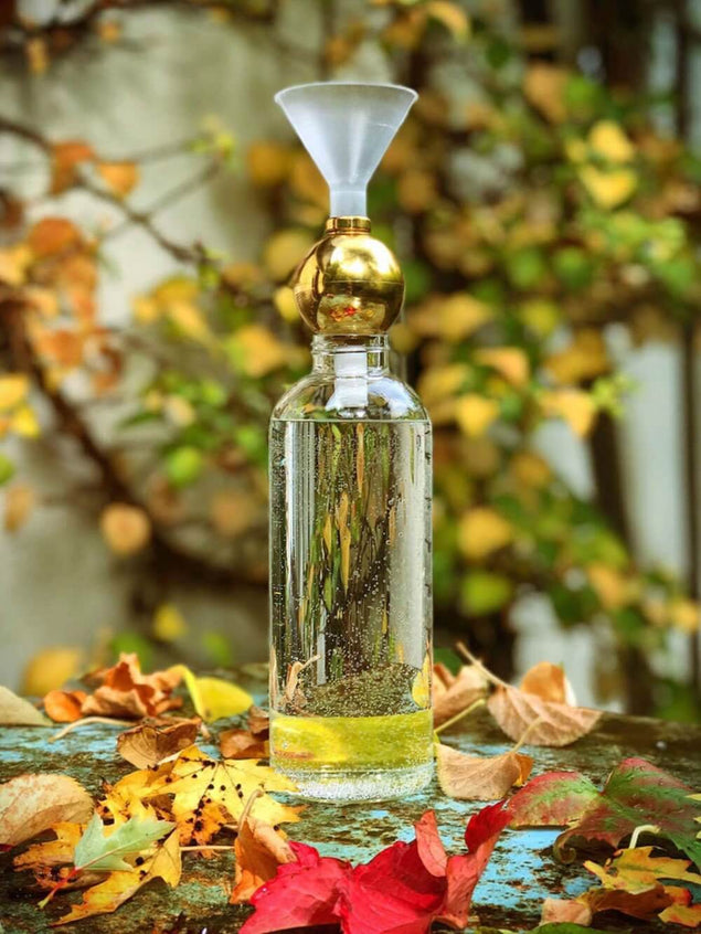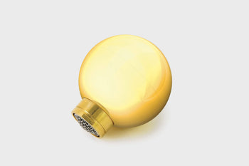 Made of brass 24 ct. gold plated. Inside a pyramid-shaped cut rock crystal with a highly stable energy field made of handmade vials of borosilicate glass vials.