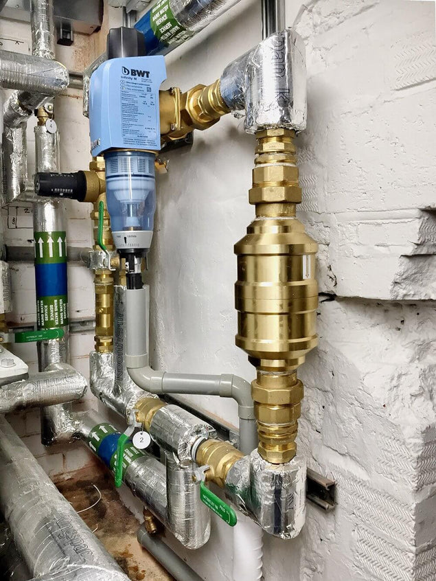 - What do I have to pay attention to during the installation?A central domestic water filter/backwash filter is a prerequisite for the installation of all UMH devices. This not only protects the domestic water installations and UMH devices against unwanted particles and deposits from the pipes, but also offers protection against damage caused by larger particles and stones that can get into the water in the event of pipe bursts. We cannot accept liability for damage caused by incorrect handling and missing domestic water filters.